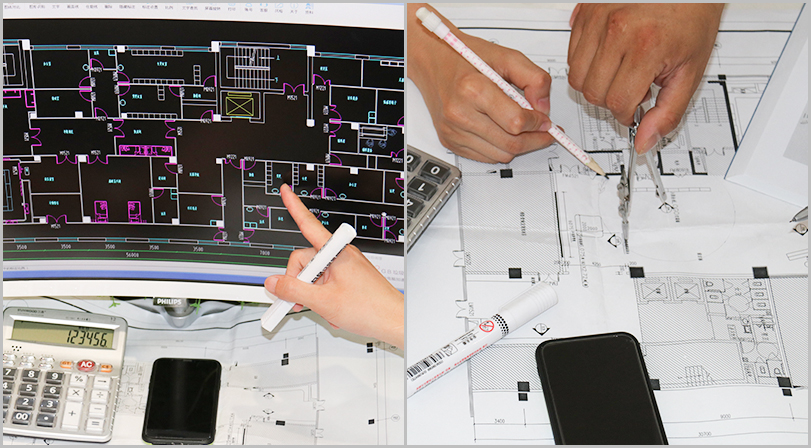 每承接一個(gè)工程,公司都會(huì)派出經(jīng)驗(yàn)豐富的技術(shù)團(tuán)隊(duì)上門勘察、實(shí)地測(cè)量,提供工程設(shè)計(jì)方案。測(cè)量各個(gè)房間尺寸及造型情況,做好記錄,做到心中有數(shù)。